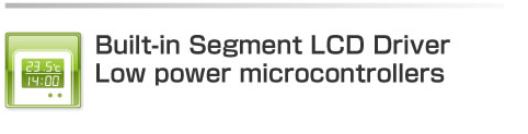 | These low-power microcontrollers with segment LCD driver integrates a boost circuit for driving an LCD. The lineup ranges from 55 to 185 segments. Additional features include built-in program memory (6KB-64KB) and RAM (192B-2KB), 2 types of serial communication interfaces (SSIO, UART) or 3 types of serial communication ports (I2C, SSIO, UART), 16bit/24bit RC oscillation A/D converter, 12bit successive approximation A/D converter, melody, buzzer, timer, and general-purpose port, making them ideal for compact, LCD-equipped devices. |