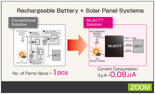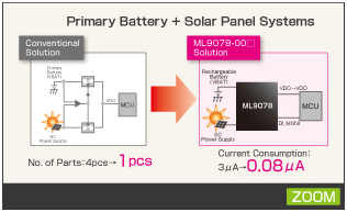 | Continuously monitors the voltage generated by the solar panel (VSC) and at the primary battery (VBAT) and selects the higher voltage for supply to the microcontroller and peripheral devices. It protects the primary battery by preventing the flow of generated current from the solar panel. High voltage supply to the microcontroller is prevented by converting the generated voltage by the solar panel to low voltage. In addition, protection functions are built in such as power supply selection monitoring, reducing peripheral circuitry significantly. Current consumption is less than 80nA (at 25°C) *For some products the current consumption is less than 150nA (at 25°C) |