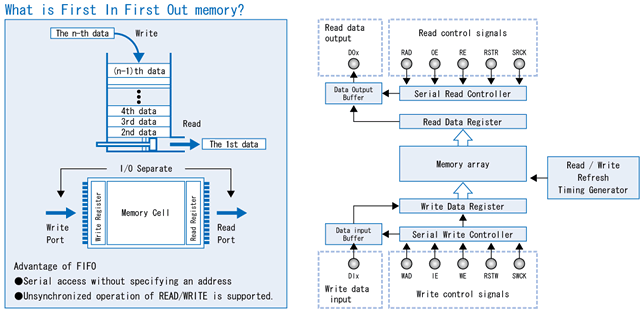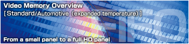 | LAPIS Semiconductor provides a wide selection of video memory developed using DRAM technology, which is suitable for image processing systems from a small panel to a full HD panel. It is CMOS dynamic memory and system access memory that operates high-speed FIFO (First-in First-out) which can operate high-speed asynchronous read/write. Serial read/serial write can be controlled indivisually in asynchronous and different clock rate by each specific clock. Moreover, because the self-refresh control circuit is built-in, it does not need to be refreshed from the outside. In addition, it realizes simple and easy video data processing by write mask function of IE terminal and skipping read data function of OE terminal. |