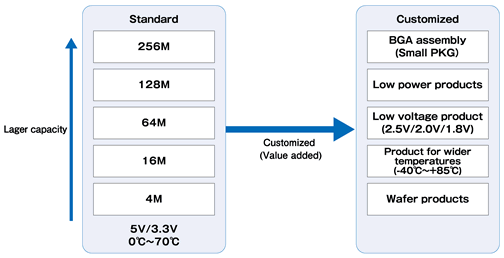 | While larger and faster DRAM occupies a larger market share, LAPIS Semiconductor provides smaller DRAM, which is difficult to obtain in these days, on a long-term stable basis. LAPIS Semiconductor provides not only standard products, which feature a wider range of operating temperature and a smaller package, but also customized products in accordance with requirements by customers. |
